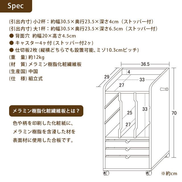 【引出内寸】(小2杯) 約 幅30.5×奥行23.5×深さ4cm (ストッパー付)