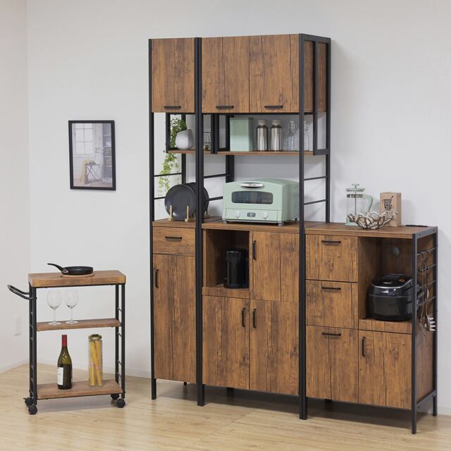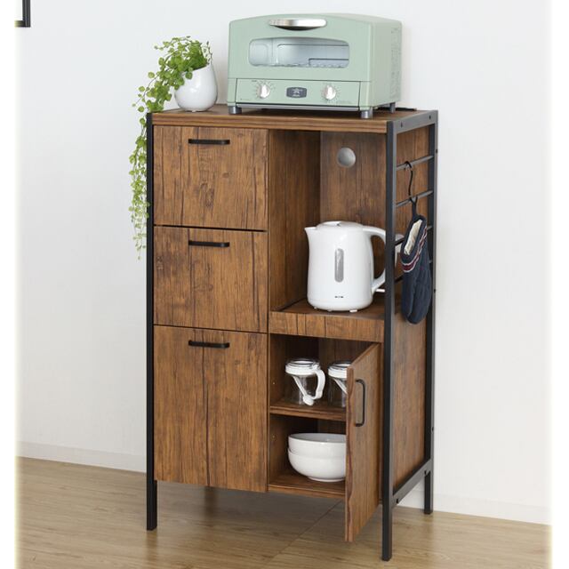 ●引出しは、スライドレールで出し入れラクラク。引出し3杯付で、下部はボトルを収納できる深さです。